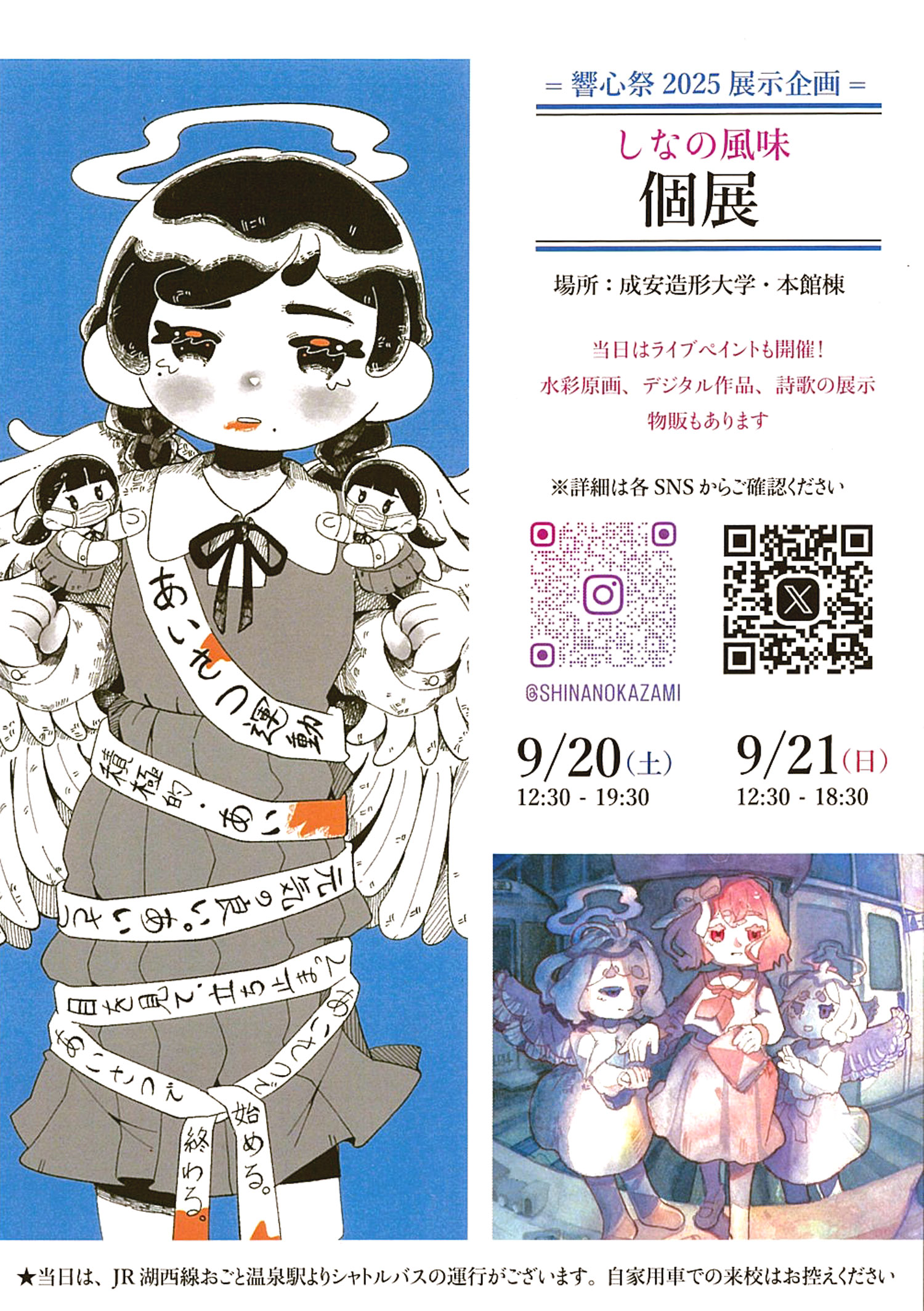 成安造形大学イラストレーション領域の在学生・しなの風味さんが「響心祭2025」にて個展を開催されます。ぜひ、ご覧ください。